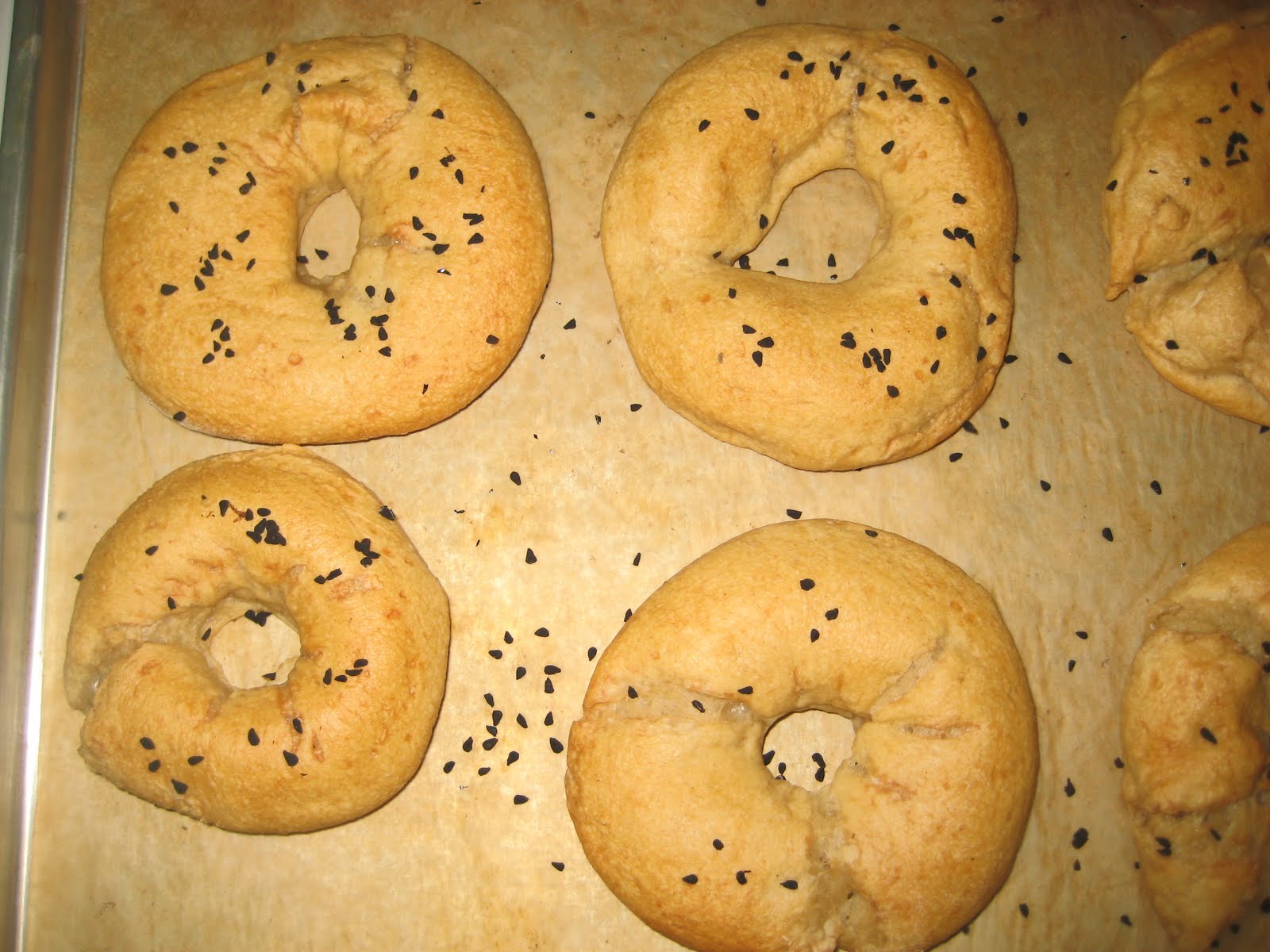 Sortir la pâte du réfrigérateur, la dégazer de nouveau et couper en petite boules. Avec un doigt fariné, faire un trou dans la boule et élargir entre les deux indexes; le trou doit être large d’environs 5 à 6 cm car il va rétrécir par la suite. Couvrir avec un linge et laisser les pains doubler de volume. Faire chauffer de l'eau dans une casserole, une fois l'ébullition atteinte, rajouter une cc de sucre et une cc de bicarbonate de soude. jeter les pains deux par deux dans l'eau et faire cuire pendant 1 minute de chaque coté; récupérer avec une écumoire et laisser égoutter sur un torchon.